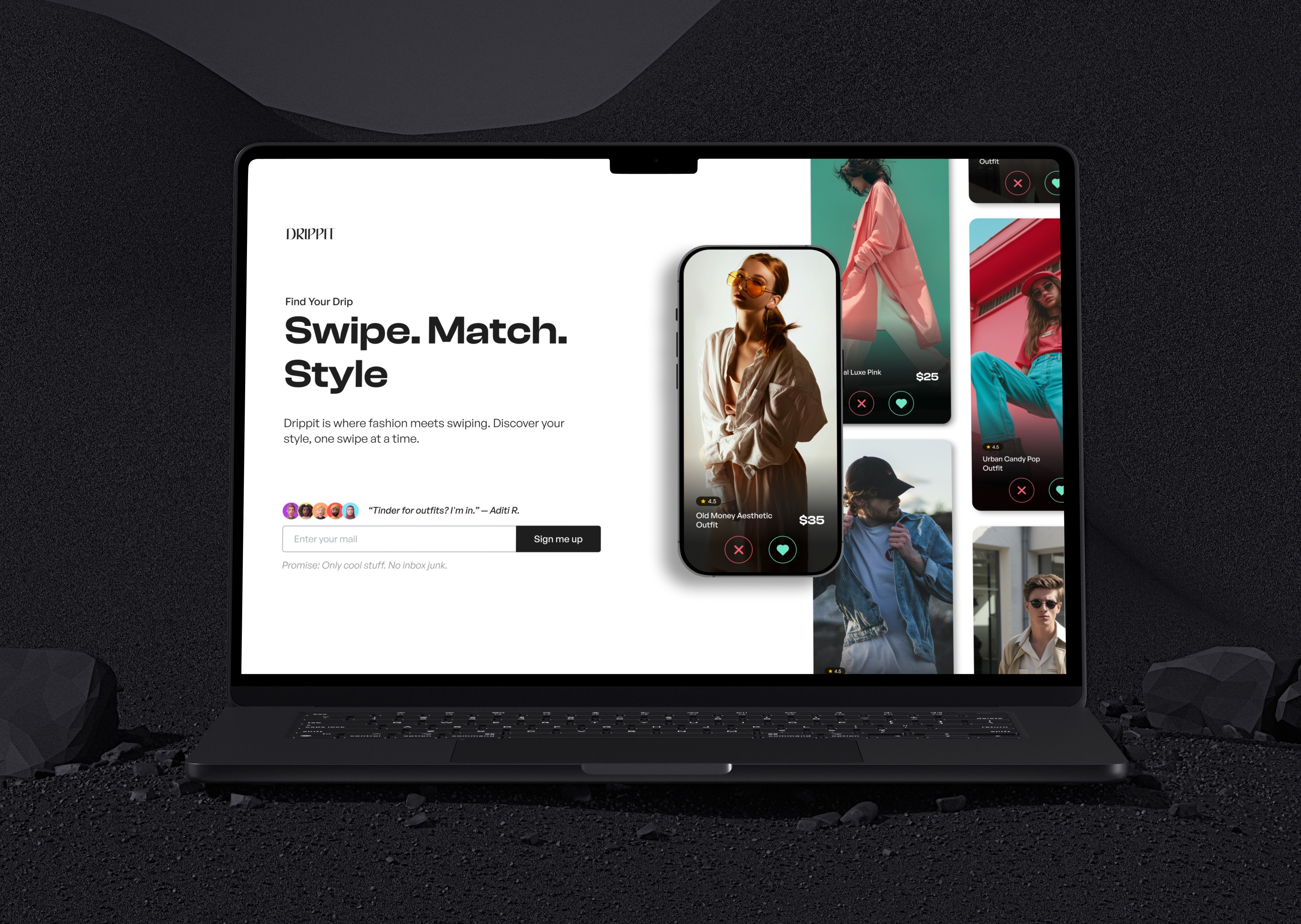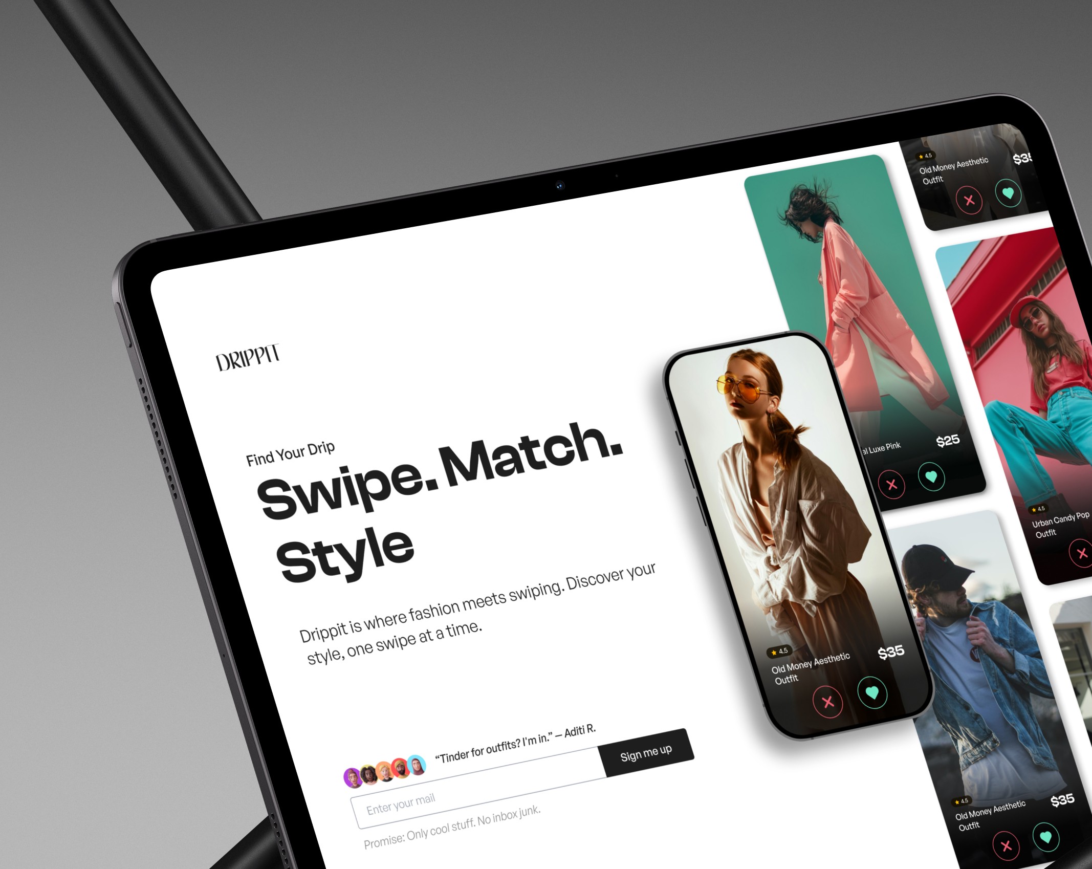 As a quick 1-hour sprint challenge, I reimagined the homepage for Drippit — a Gen Z-focused fashion discovery startup. The redesign addressed inconsistencies in typography, lack of visual hierarchy, and underwhelming use of color. My goal was to create a more cohesive, vibrant, and engaging interface that reflects the brand’s swipe-based shopping experience while enhancing its visual appeal and credibility.