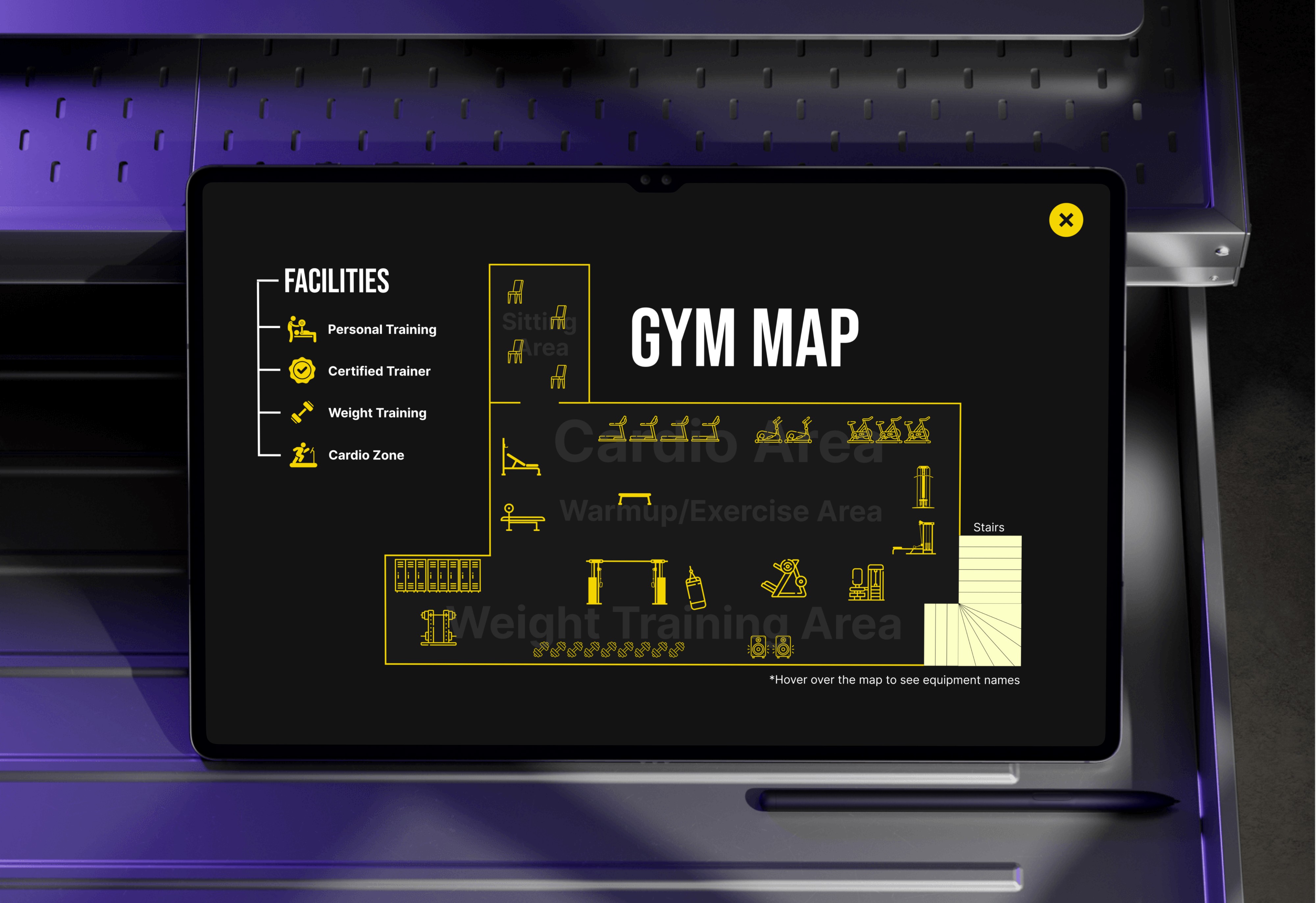 Navigating college gym spaces can be confusing for new users, especially when equipment and facilities aren't clearly labeled or accessible. To address this, I designed an interactive gym interface for a campus kiosk. The experience allows students to explore the gym layout, understand equipment placement, and familiarize themselves with available zones—bringing physical space into an intuitive digital map through Figma prototyping.